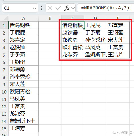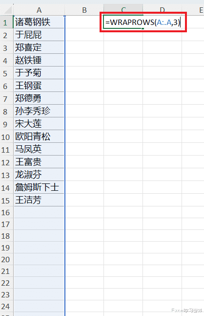 语法为 WRAPROWS(需要转换的区域,行数,要填充的值;默认值为 #N/A);