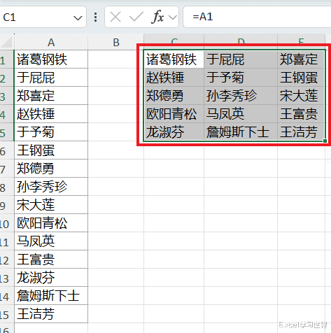所以公式的作用就是将区域 A:.A 转换成 3 列的区域;