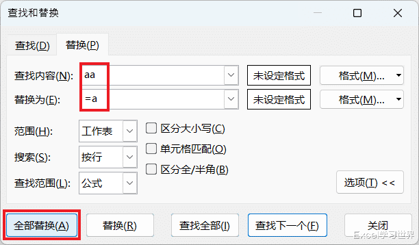 8. 按 Ctrl+H --> 在“查找内容”处输入“aa”,“替换为”处输入“=a”--> 点击“全部替换”